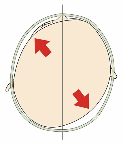 斜頭症は、向き癖による頭の変形です。見た目の左右差や、帽子やメガネがまっすぐかぶれないことなど、成長とともに気になることがあるかもしれません。